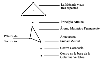 [LAHR:] La construcción del Antahkarana está regida por la Ciencia de los Triángulos, pudiendo entenderse como la construcción de un triángulo equilatero entre la unidad mental (mente concreta), el loto egoico (la conciencia del ángel solar) y el átomo mental permanente (mente abstracta). Sólo así la conciencia búddhica (Venus) puede expresarse a cabalidad.